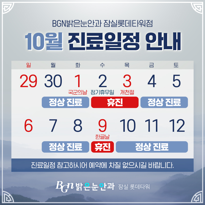 BGN밝은눈안과 10월 진료일정 안내
